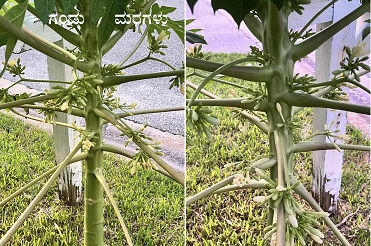 ಹಾಗಾಗಿ ಆಕಸ್ಮಿಕವಾಗಿ ನಾವು ನಮ್ಮ ಮನೆಯ ಹಿತ್ತಿಲಲ್ಲೋ ಅಥವಾ ಕೈತೋಟದಲ್ಲೋ ನೆಟ್ಟ ಒಂದೇ ಸಸಿಯು ಗಂಡೋ ಹೆಣ್ಣೋ ಎಂಬುದನ್ನು ಮೊದಲ ಹೂವು ಬಿಟ್ಟಾಗಲೇ ಗುರುತಿಸಬಹುದು. ಬಿಟ್ಟ ಹೂವು ನೇರವಾಗಿ ಕಾಂಡಕ್ಕೆ ಅಂಟಿಕೊಂಡಂತೆ, ಅದರ ಹೂತೊಟ್ಟು ಇದ್ದರೆ, ಹೂತೊಟ್ಟು ತೀರಾ ಉದ್ದವಾಗಿಯೂ ಇದ್ದರೆ, ಜೊತೆಗೆ ಹೂವುನ ಪಕಳೆಗಳು ಮುರುಟಿಕೊಂಡಂತೆ ಇದ್ದರೆ ಅದು ಖಂಡಿತಾ ಗಂಡು ಮರ! ಆಗ ಒಂದೇ ಇದ್ದರೆ ಉಳಿಸಿಕೊಳ್ಳುವುದರ ಅಗತ್ಯವೇ ಬರದು. ಅಂತಹವೇನಾದರೂ ತೋಟದಲ್ಲಿ ಹತ್ತಾರು/ನೂರಾರು ಪಪಾಯ ಮರಗಳ ಜೊತೆಗೆ ಇದ್ದರೆ, ಪರಕೀಯ ಪರಾಗಸ್ಪರ್ಶಕ್ಕೆ ಅನುಕೂಲವಾದೀತು.