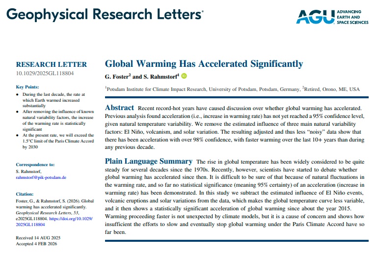 Foster, G., & Rahmstorf, S. (2026). Global warming has accelerated significantly. Geophysical Research Letters, 53, https://doi.org/10.1029/2025GL118804