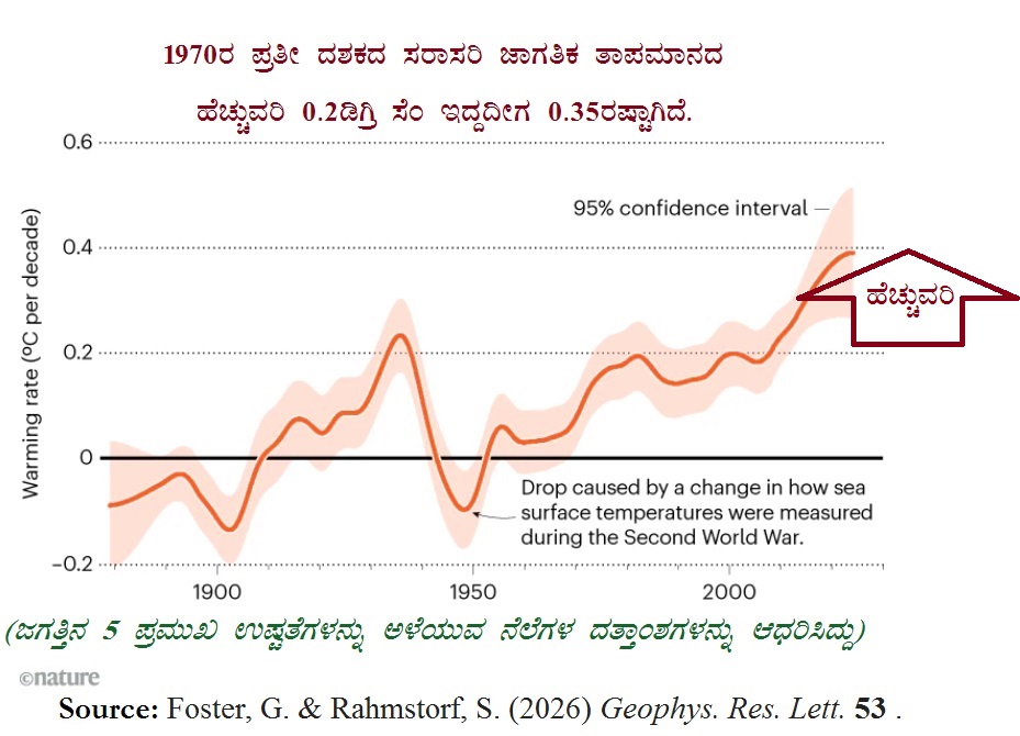 ಈಗ ಎಲ್ಲೆಡೆ ಬಿಸಿಲು ಏರುತ್ತಿರುವ ಅನುಭವದ ಮಾತುಗಳು ಸಾಧಾರಣವಾಗಿ ಕೇಳಿ ಬರುತ್ತಿವೆ. ಇದು ಕೇವಲ ನಮ್ಮಲ್ಲಷ್ಟೇ ಅಲ್ಲ! ಬಹುಪಾಲು ಇಡೀ ಭೂಮಿಯನ್ನೇ ಆವರಿಸಿಕೊಂಡಿರುವ ವಿಚಾರವೂ ಹೌದು. ಅದರ ಜೊತೆಗೆ ಇದಕ್ಕೊಂದು ವೈಜ್ಞಾನಿಕ ಸಾಬೀತನ್ನೂ ಕೂಡ ಇದೇ ಮಾರ್ಚ್ ತಿಂಗಳ 6 ರಂದು ಪ್ರಕಟವಾದ ಸಂಶೋಧನಾ ಲೇಖನವೊಂದು ನೀಡಿದೆ. “ಜಾಗತಿಕ ತಾಪಮಾನ ಏರಿಕೆ ಗಮನಾರ್ಹವಾಗಿ ಹೆಚ್ಚಾಗಿದೆ” ಎಂಬ ಶೀರ್ಷಿಕೆಯಲ್ಲಿ ಪ್ರಕಟವಾದ ಈ ಸಂಶೋಧನಾ ಲೇಖನವನ್ನು ಆಧರಿಸಿ ಅದರ ಕುರಿತಂತೆ ವಿಖ್ಯಾತ ವಿಜ್ಞಾನ ಪತ್ರಿಕೆಯಾದ ನೇಚರ್ ಪತ್ರಿಕೆಯೂ ಕೂಡ ಈ ವಾರದ ಸಂಚಿಕೆಯಲ್ಲಿ ಒಂದು ವರದಿಯನ್ನೂ ಪ್ರಕಟಿಸಿದೆ.